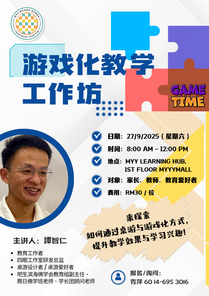 为配合 MyyMall(也称Myy社区)月色生活节,并推动游戏化教学在美里社区的普及,Myy Board Games 桌游馆将于来临星期六(27/9)举办一场“游戏化教学工作坊”。